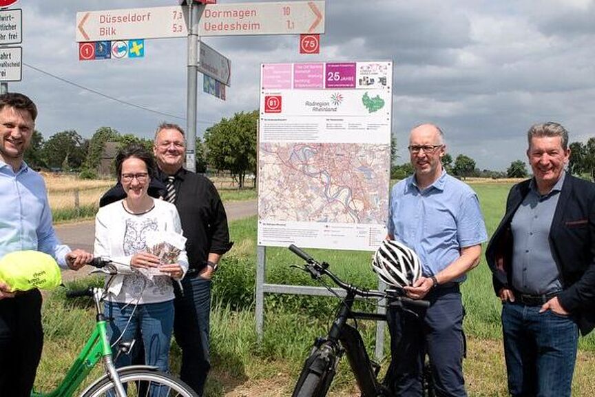 Die Tafeln der Knotenpunkte für die Radfahrer im Rhein-Kreis Neuss werden erneuert. In Neuss und Meerbusch wurden die ersten Exemplare bereits ausgetauscht, die anderen werden folgen. In diesem Zug wurden auch die Hinweise und Vorgaben zur Gestaltung der Knotenpunkt-Tafeln aus dem neuen Handbuch des Vereins Radregion Rheinland berücksichtigt. Im Sinn der Qualitätssicherung radtouristischer Beschilderung sind darin erstmals einheitliche Kriterien entwickelt worden. Kreisdezernent Martin Stiller, Tourismusförderin Steffi Lorbeer, Michael Fielenbach, der Leiter des Kataster- und Vermessungsamts, und sein Mitarbeiter Reiner Kulp sowie Markus Vidahl von der Firma LVE Commercial sahen sich jetzt das Ergebnis am Rhein-Radweg bei Uedesheim an und zeigten sich vollends zufrieden mit dem Werk.
